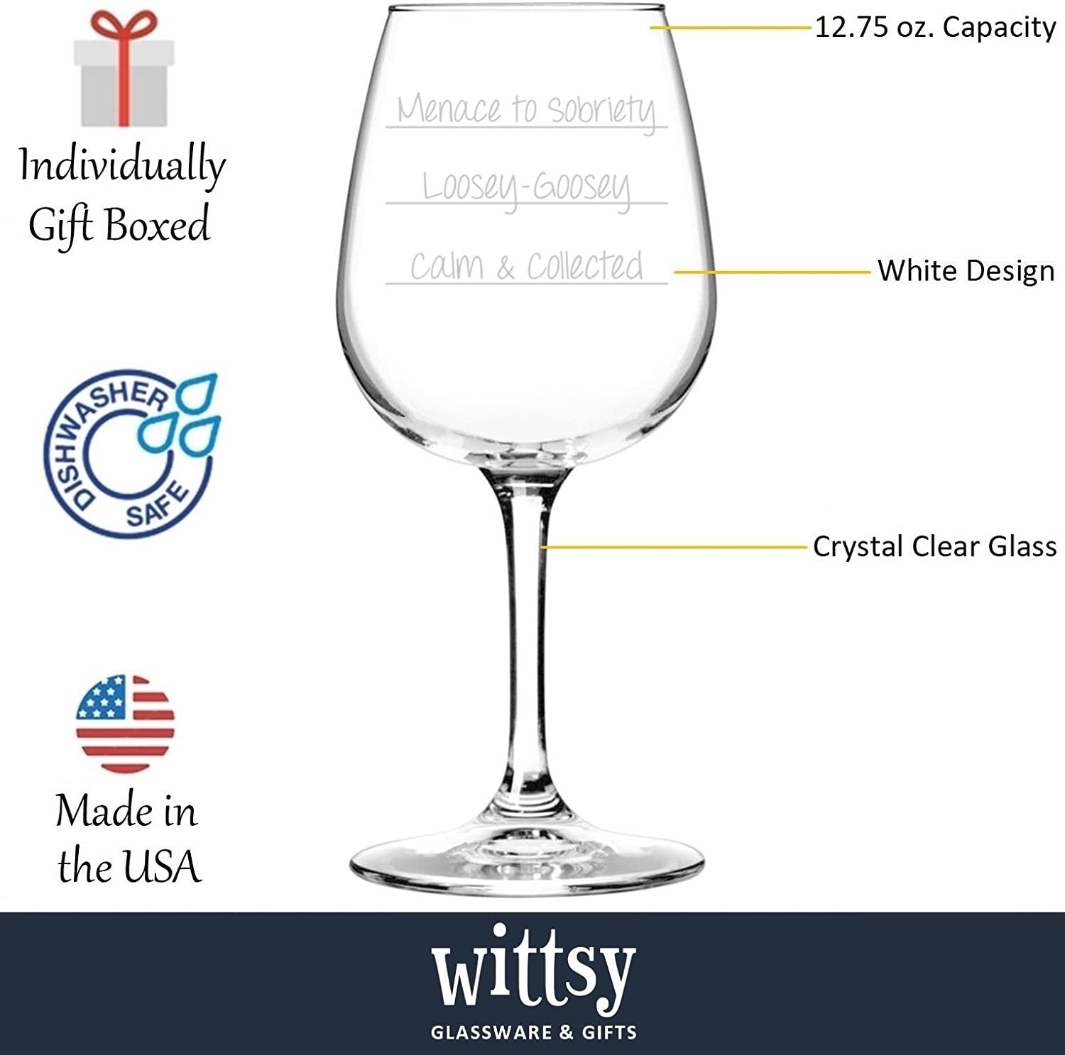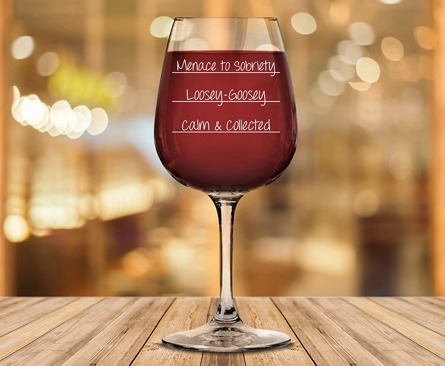 - A PERFECT GIFT FOR WINE LOVERS - A humorous & useful present showing different pour levels - Calm & Collected, Loosey Goosey, Menace To Sobriety; great for drinking red or white wine