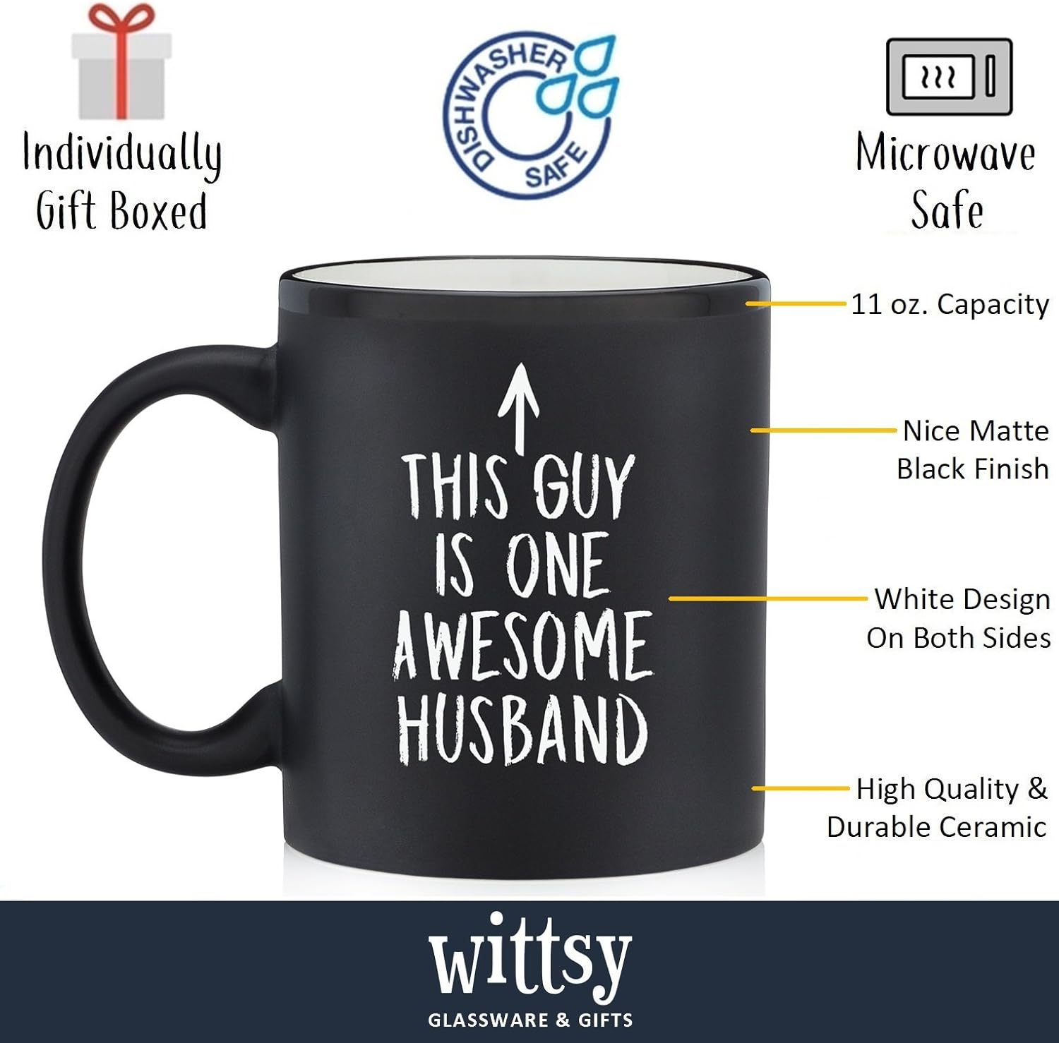 - The Perfect Gift For Guys - Our This Guy Is One Awesome Husband mug makes a humorous present for your husband; has an arrow pointing up to him so every time he uses the cup he's reminded how awesome you think he is