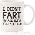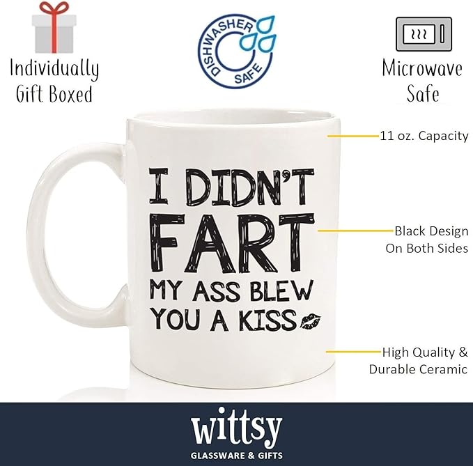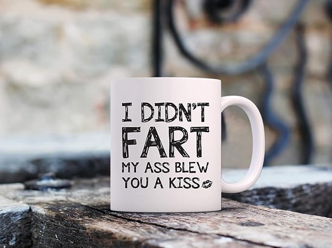 - The Perfect Gift For Guys - This funny coffee mug with adult humor makes a hilarious gag gift for a father or husband from son, daughter or wife; the design says I Didn’t Fart My A** Blew You A Kiss